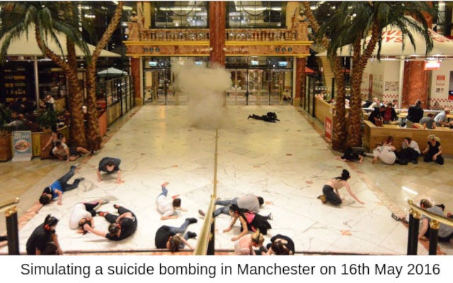 Governments use crisis actors and simulate realistic civil emergencies, such as terrorists attacks. There is a global crisis actor industry dedicated to hoaxing such events. There are discrepancies between witness statements and official reports into the alleged bombing. There is evidence suggesting some people had foreknowledge of the reported attack. There is a dearth of photographic and video evidence supporting the official narrative. This has all been reported by Richard D. Hall.