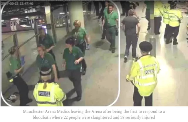 Hall also reported that the first responders inside the City Room were the Arena medical team. They are seen on CCTV, casually strolling out of the City Room at 23:51, just nine minutes after the last of the 38 treated casualties, that they were reportedly working on, were moved out of the City Room.