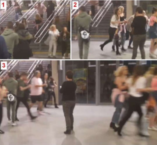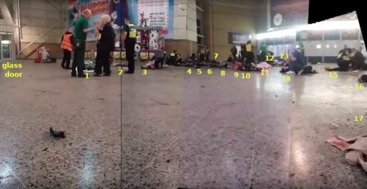 Nor are anywhere close to 60 dead, dying and injured people observable in the BBC footage shown in their documentary “Manchester the Night of the Bomb.” Though very blurred, this did at least give us a wider view of the scene inside the City Room immediately after the alleged bomb exploded. It doesn’t support the official account either.