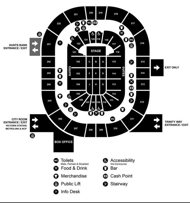 Sanders then offers some wild speculation about what Kenney is observed doing in the Bickerstaff video. Kenney was evidently heading toward the bar, which is located on the main Arena side of the concourse, opposite but below blocks 208 and 209 (see image below). From Kenney's location, as seen in the Bickerstaff video, the two possible exits are more or less equidistant. He could leave the Arena by running toward the City Room or Trinity Way exits. If he wanted to access the NCP car park, his quickest route would have been via the City Room exits. He does not appear to heading toward either in the Bickerstaff video.