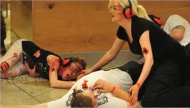 Moulage is applied to make crisis actors appear to be severely injured, dead or dying in training exercises and, taking all the other evidence as a whole—which we’ll get to shortly—the event in the City Room was observably more consistent with a staged training exercise than a real shrapnel bombing.