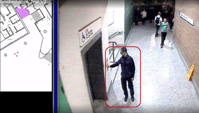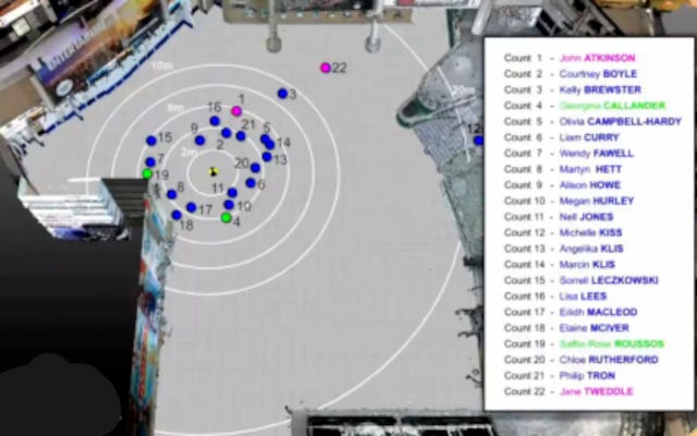 At 50:05 in this video, Hall reports the movement of Jane Tweddle and Lisa Lees shortly before the bang. Their repositioning appeared to allow better access to and from the mysteriously redacted CCTV area outside the lift. Hall speculates that the hidden area may have been a staging point for crisis actors. While we cannot know if this is accurate, no explanation has ever been offered to account for the CCTV redaction.