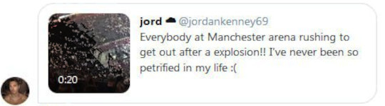 The point is, Jordan Kenney was inside the main Arena after the bang. He then fled the main concert Arena, via the concourse, with everyone else. There is a screenshot of Kenney's post below. Kenney said that after the bang he had "never been so petrified" in his life.