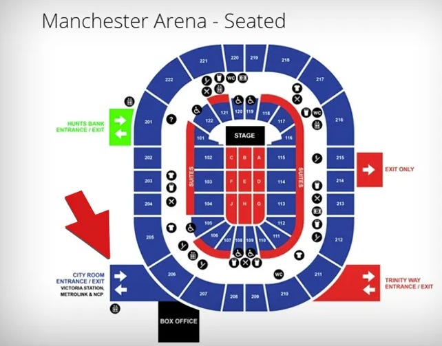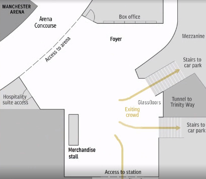 In 2017, if you were leaving the arena via the concourse located near the City Room, the then NCP car park was best accessed by going through the City Room. Therefore Sanders explained debunk makes no sense. Hall's observation that this is evidence suggesting Showsec stewards were turning people away from the City room before the bang has not been "debunked" by Sanders. Brent's and Neil's offered debunk is factually wrong.