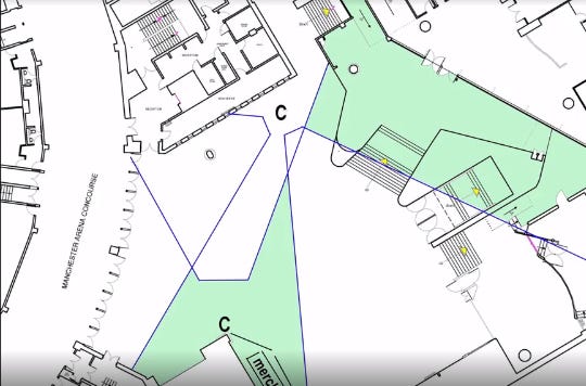 I have also searched the same images and I cannot see 18 of the 22 allegedly deceased victims in the claimed final moments before the blast either. An important caveat, as noted by Hall, is the potentially significant CCTV blind spot (shown below highlighted in green). Only the blind spot marked ‘C’ is relevant.