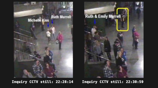 At 22:28:14 Ruth Murrell and Michelle Kiss are seen stood together in the City Room. At 22:30:59, supposedly one seconds before the blast, Ruth Murrell is stood on the steps next to her daughter, Emily.