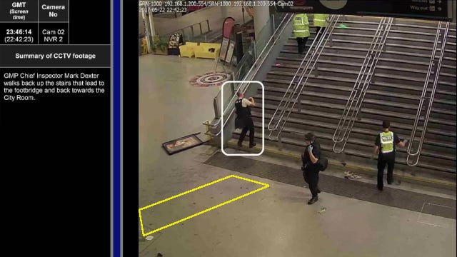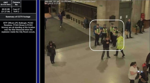 WPC Bullough was caught on CCTV again, no more than 30 meters away from her starting position, running across the platform at 22:31:37. She is then seen arriving in the City Room (Manchester Arena foyer) at 22:31:47.