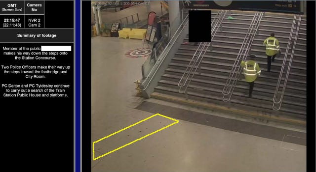 At the inquiry British Transport Police WPC Bullough testified that she was stood next to the War Memorial in Victoria Station when she heard the bang. Upon hearing it, she said she immediately ran to the City Room. Yet at 22:31:09, nine seconds after the alleged time of detonation, she is seen on CCTV chatting to colleagues at the War Memorial.