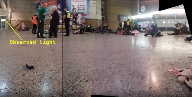 In my previous film, I suggested that these images (Parker photo and stills from the Barr footage) of the City Room were probably taken in the morning in some sort of drill or preparation. CCTV evidence, which has been released since I made that film, has led me to suspect that these images may have, in fact, been taken shortly after the time of the blast. The evidence is conflicting, as the timestamp on the Chris Parker image clearly shows a much earlier time. But I am going to go with the official narrative here, that these images were taken shortly after the blast. No building damage can be seen in this image. The merchandise stall is completely intact. Other images taken show that windows were not shattered by the blast. This image (Chris Parker photo) does not show convincing evidence of an injury or deaths. Although a firm conclusion cannot be drawn from these images alone, about whether the victims pictured are real or staged, the images are consistent with a drill or exercise. Now, the public inquiry did produce photographs showing building damage, for example to the blue and white doors seen in these pictures, However, none of that damage can be seen in these images, which were taken much earlier than the crime scene images produced in the inquiry. [emphasis added]