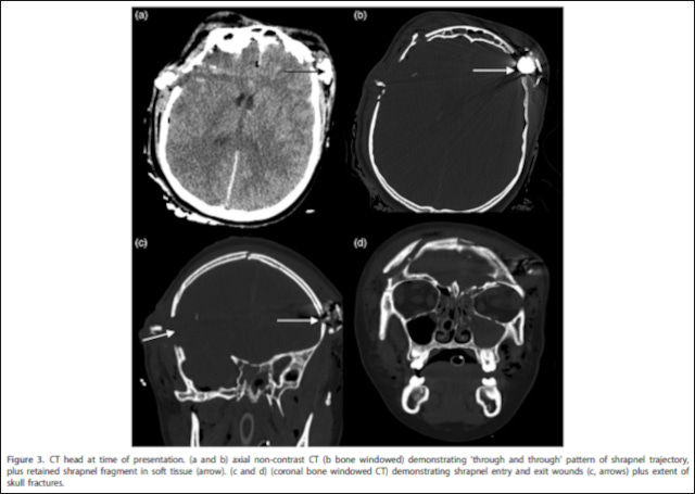 A 15-year-old was triaged as and received basic resuscitation at the scene, arriving at our institution at 00:25. [. . .] CT [computed tomography scan] brain identified a ‘through and through’ pattern of injury from a shrapnel trajectory, extensive scalp fractures and evidence of retained shrapnel fragment. [. . .] A piece of shrapnel in the form of a large metal nut was retrieved from left fronto-temporal soft tissue.