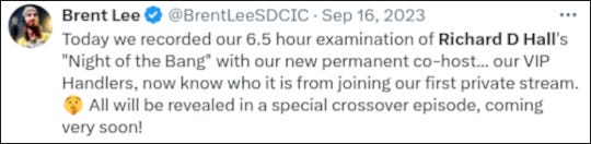 Brent states that the pair finalised recording of their “6.5 hour examination of Richard D Hall's Night of the Bang" on 16th September 2023. It seems likely that Sanders obtained the death certificate around this time.