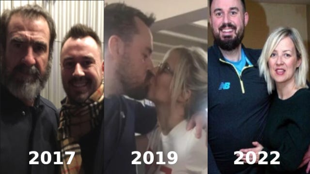 Sanders then comes to, what he appears to believe, is the real clincher debunk that proves Martin Hibbert must have been injured by a shrapnel bomb. On his Facebook page, taken in February 2017, there is a photo of Martin Hibbert stood next to the footballer Eric Cantona. This, Neil claims, proves that he was not injured before the bang.
