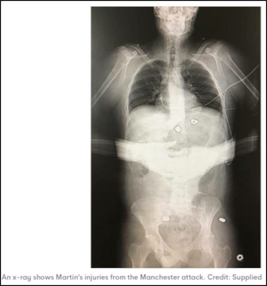 Martin Hibbert and Eve are often reported as being the people closest to the alleged shrapnel bomb to have survived. In this legacy media report they were supposedly 5m from the massive TATP bomb packed with 30kg of shrapnel. It should be noted that this distance has varied from “right next to” to 10m or 2m or 5m, depending on when Mr Hibbert’s account was reported or which outlet reported it.