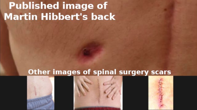Sanders contends that the images Martin Hibbert provided of his back, which Hall suggests are consistent with herniated disc surgery, not bomb shrapnel extraction, does not look like disc surgery scarring because it's "off to the side" of Hibbert's spine and "not directly over the spine" as it would be in a herniated disc operation.