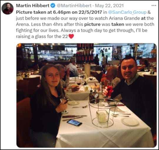 The image was posted on Twitter on the 22nd May 2017 at 6.53pm. [Martin] Hibbert posted the image again four years later. And this time felt the need to state the exact time the photograph was taken. [. . .] He has used the Twitter post to claim that the photograph is why everybody knew they were at the concert. [. . .] I am not aware of any photographic evidence that places them at the actual Arena that night.