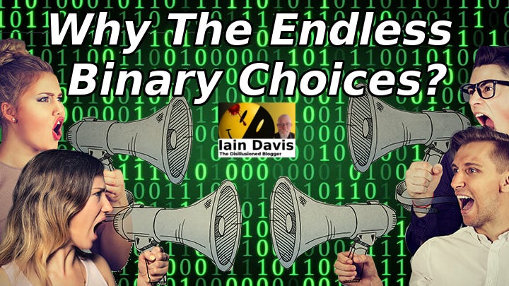 We are functioning transistors in the binary logic of a circuit board that we neither own nor design. This apparent inability to step outside the fake binary erodes our ability to communicate ideas, stifles debate, shuts down the exploration of more complex issues and ultimately makes us all the more easy to manipulate.